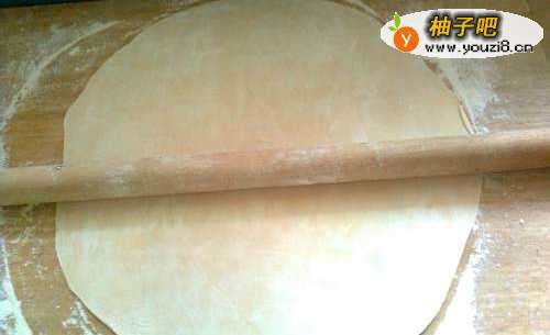 和面擀饼。这个过程如果你没有做过看起来很难,实际上很简单,就是拿一定量的面粉,加上水并且用手按压翻滚,最终成型,注意把握加水量,最终做成一块软和的面团。之后用擀杖擀面,把它压成一张面皮,不需要太薄,只要不太厚就行,大约厚度如厚的饺子皮即可,而硬度也相似。