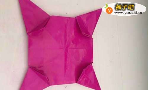 2第二步 折叠完之后 拿起彩纸角上的第一道折痕向里折叠一个小正方形 其它三个角都向里折叠一个小正方形