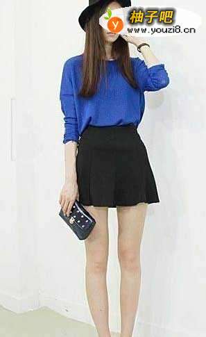 4宝蓝色套头毛衣典雅大方,这种颜色深受女孩子们的喜爱,因为能提升整体的优雅气质,还很衬肤色,配黑色短裙秀出美腿,显得十分精神,吸睛指数也是一流的。
