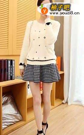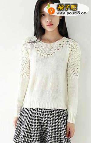 5经典的白色毛衣自然是不可或缺的,还有什么颜色比它更能彰显清新纯净的美好感觉呢?这款白色毛衣领口和肩部采用镂空花纹编织,更显柔美,下搭千鸟格短裙,好一个温柔似水的清纯女孩。