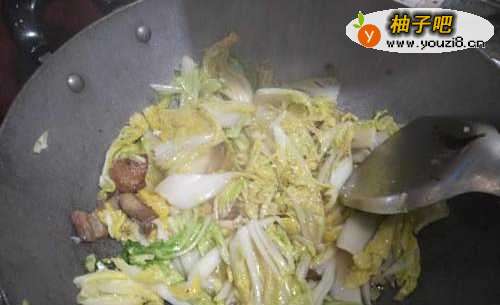4然后加入大白菜梆子,因为菜梆比较难熟,所以先炒一下菜梆。