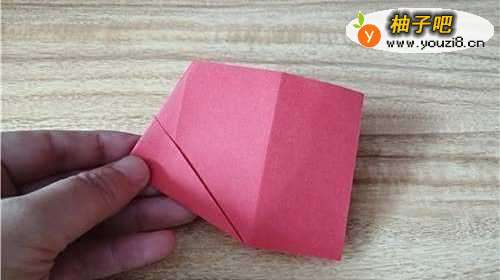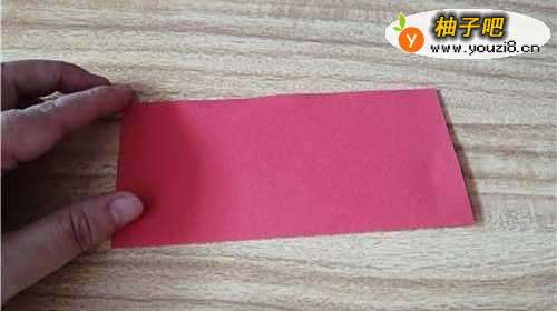 首先把彩纸的下边向上折,如图一。再把左侧的边向右折,如图二。