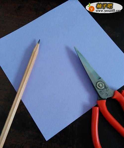 我们先准备好一张正方形彩纸,一支铅笔,一把剪刀。