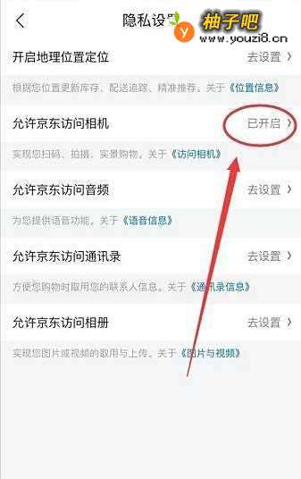 6设置好之后,再返回到京东隐私设置页面,就可以看到 允许京东访问相机 已开启,这样就设置成功啦
