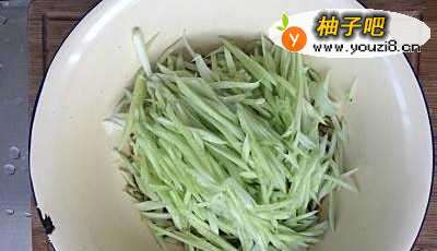 3黄瓜首先切成片,然后切成丝。刀工不好,也无所谓,黄瓜丝粗一些不妨碍口感。