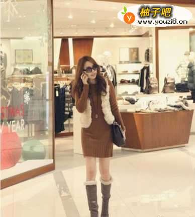 4乍暖还寒的季节穿一件长款的单色毛衣,脚踩一双毛边的高筒靴子,给人干练利索的感觉,这时候搭配上一件短款的时尚皮草马甲,感觉浑然一体,整体搭配合理,时尚。