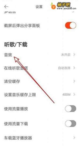 4在打开的虾米音乐的设置页面中点击“音效”的菜单项。