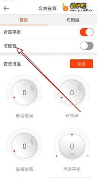 5这时会打开音效的设置页面,在页面中我们找到“防破音”的设置项。