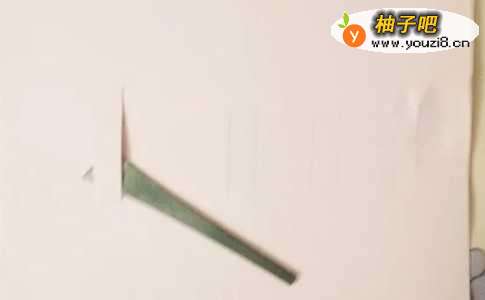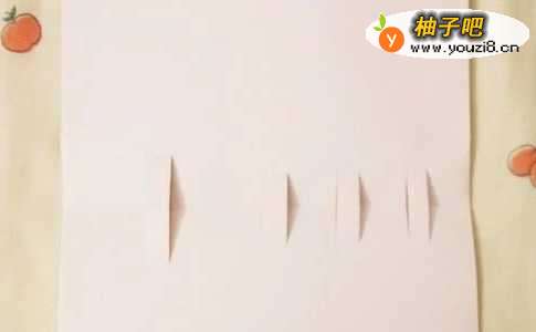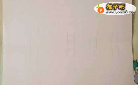3用笔在彩纸上对中间线为对称轴,左边画两条六公分长的直线,往右每隔一段距离画两条四公分长的直线,每两条直线之间宽度为一公分。