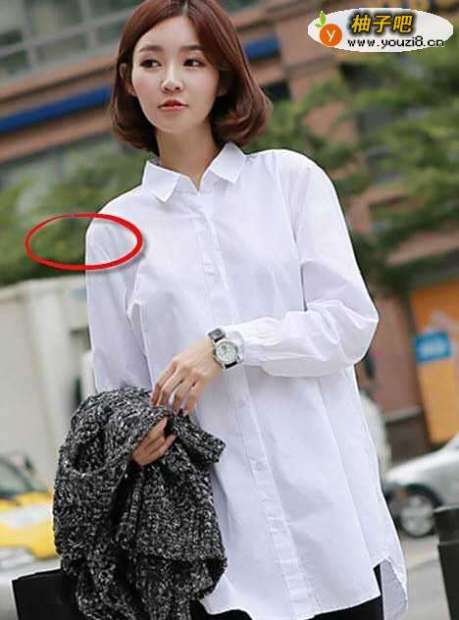 以上问题都避免以后,我们再来看长款白衬衫的穿搭技巧。选择长款白衬衫,很重要的一点是肩线的位置,就是说肩膀一定要合适。肩膀如果不合适的话,会看上去很邋遢,不干练,甚至会压低身高。来看案例