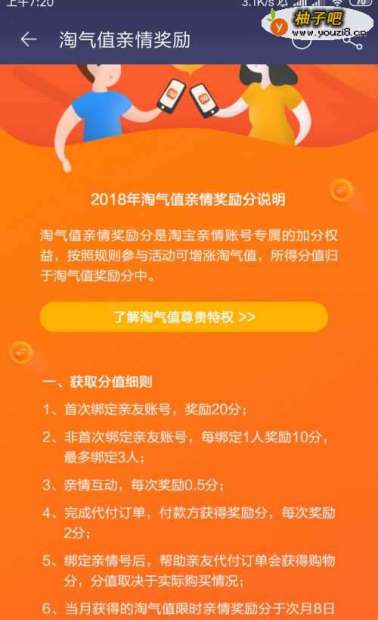 3亲情奖励分是淘宝亲情账号专属的加分权益,可以增加淘气值。首次绑定加20,每绑定一人加10 ,最多3人。