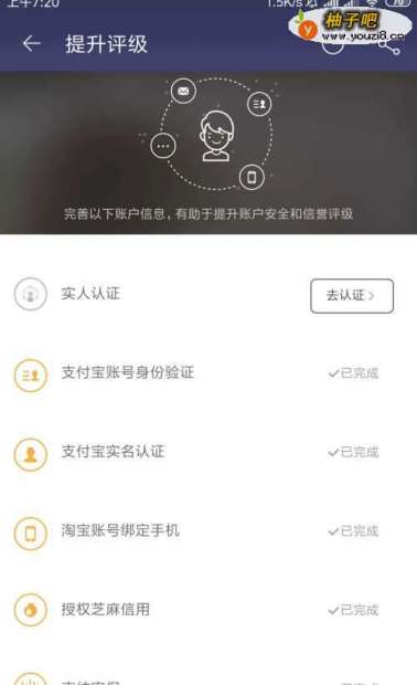 2补全个人信息,包括实名认证、声纹密保、身份验证、绑定手机、授权芝麻信用都需要完善。