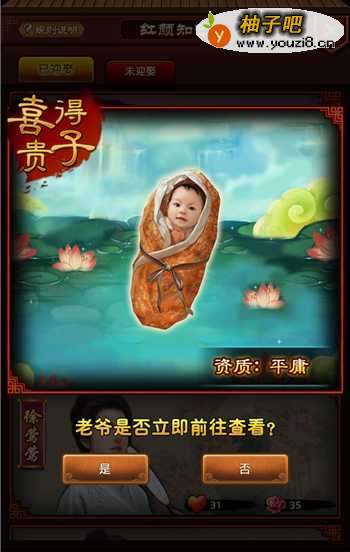 当游戏中出现如下图所示画面时,代表生育成功。ps:子嗣系统中留两个空位有可能获得双胞胎哦。点击查看即可从红颜系统转到子嗣系统。点击赐名可给子嗣取名字。第一次取名字是免费的(可系统随机取名),之后每改一次名需要花费10元宝。子嗣成年后也可改名字,结婚后就无法更改了。