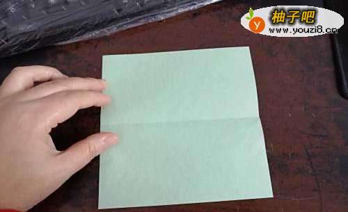 首先把彩纸的下边向上折,然后再中线对折,如图。