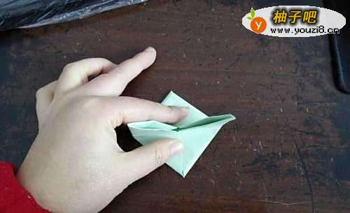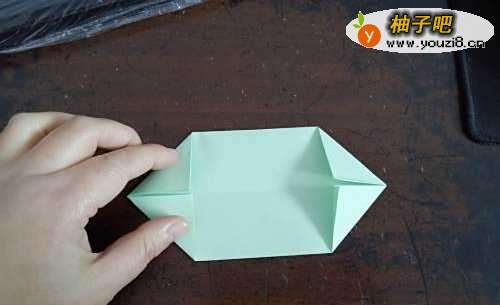 4然后我们按照折痕把边一起向内折,就成了图二的样子。把下侧的边向上折,如图三。