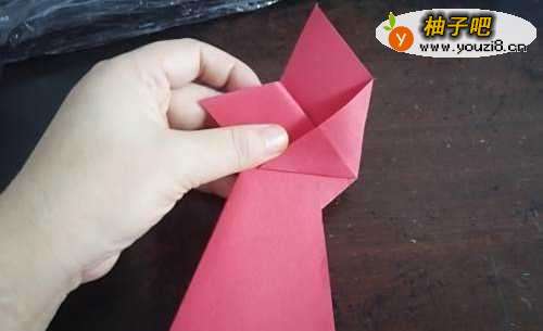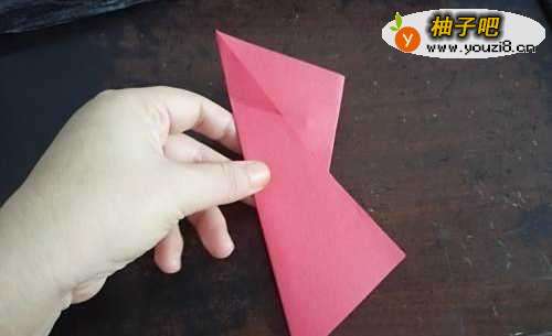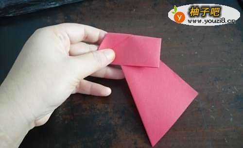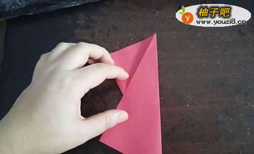 2把左下角沿对角线向右翻折,如图一。然后把彩纸翻到另一面,如图二。