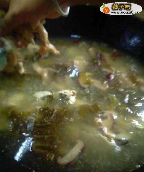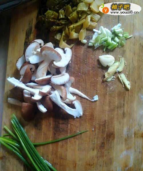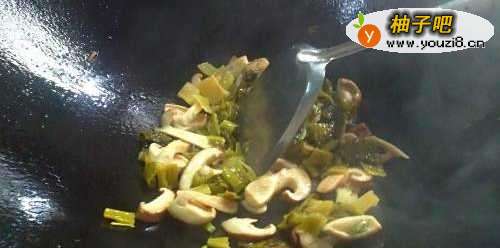 3放入香菇酸菜爆炒,加少许盐酱油;