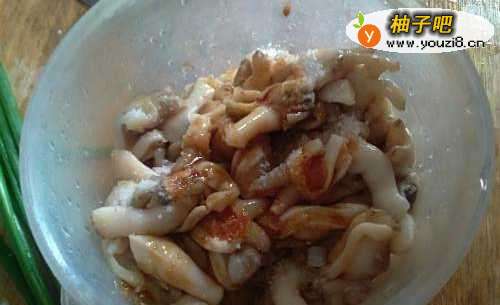 5等汤沸的时间我们可以来处理蛏子,加入酱油盐,搅拌腌制几分钟,放入地瓜粉轻轻搅拌备用;