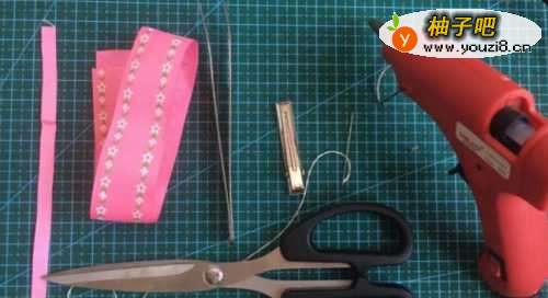 材料准备:2.5cm宽的印花螺纹带,长度是37cm、0.6cm同色螺纹带、4.5cm鸭嘴夹、馒头珠、针、线、打火机、剪刀、镊子、胶枪