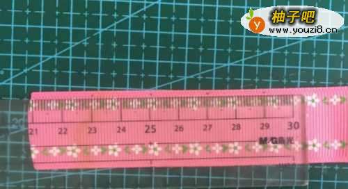 22.5cm宽的带子先两头用打火机烧一下,要快速的烧,目的是防止在接下来的制作中出现抽丝,然后用尺子在丝带上每隔2cm用笔做一个标记,不要点太大,能看清就行。
