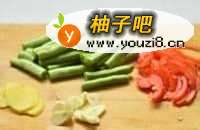 2豆角撕去两头的老筋后切段,红椒切丝,姜和蒜切片