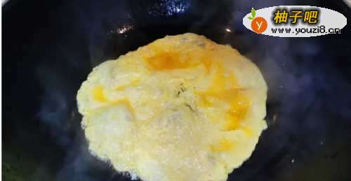 2起锅热油,转开小火,放入蛋液,慢慢煎成金黄色。