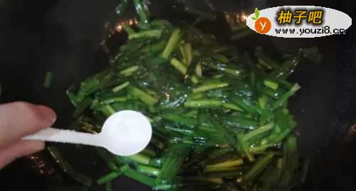 5韭菜炒至2分钟左右,放入少许食盐,调小火翻炒。