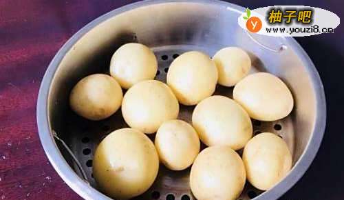 小土豆洗净带皮蒸个20分钟左右(蒸制时间以土豆蒸到用手按压感觉到柔软为标准20至30分钟)