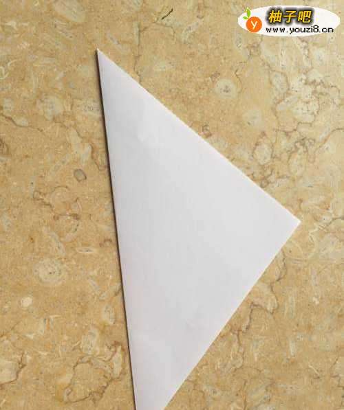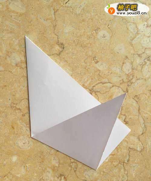 我们先把正方形的纸左右两个对角对折起来,把左侧压平