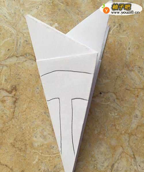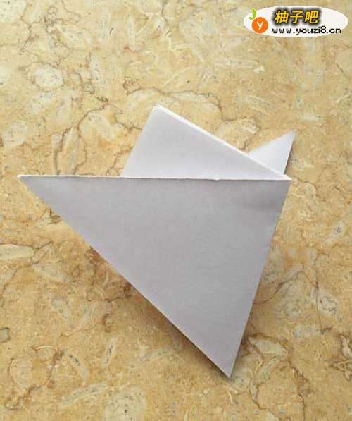 3我们再把上面的尖角如下图一样向后向下折叠起来,与上面的边对齐