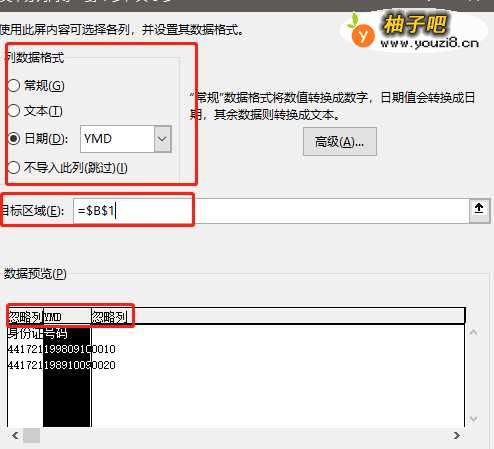 6把分开的三部分分别设置为忽略、日期、忽略,并且目标区域设置为隔壁单元格,然后点完成