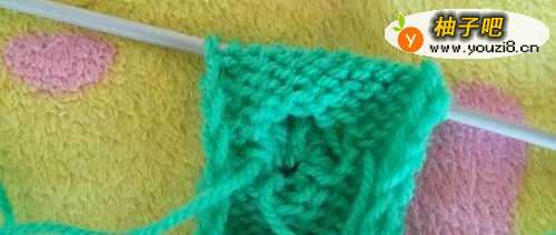 5扣子的织法。我们在扣眼位置相对应的另一片织扣子。在这个位置的三针,从中加出两针,共五针,用平针单织这五针,能够包过扣子,我织了八行,收针。其余织法和扣眼一样,反过来时,在这个位置加三针。