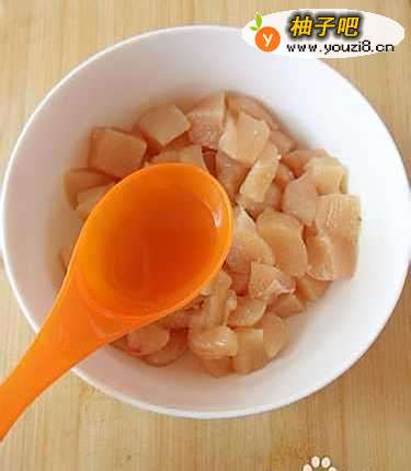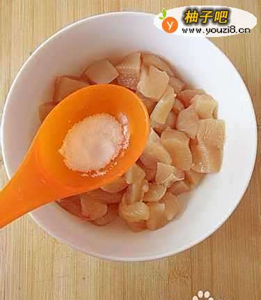 3鸡胸肉洗净后切成小块状,再加入少许盐。