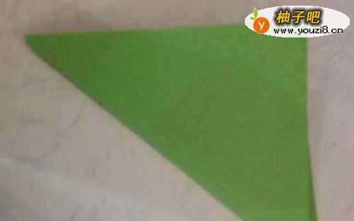5花做好了之后,现在我们来做叶子。准备一张正方形绿色彩纸,对角对折,剪出一点弧度,展开后就是一片叶子了。然后,将叶子沿中线折出折痕,再对折,中间涂白胶粘好,这样,叶子就做好了。接着,再做一片剪开,就得到一片单叶。