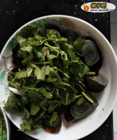 4第四步,把调好的香菜和松花蛋再混合在一起调一调,一道吃了不上火的松花蛋就做好了。