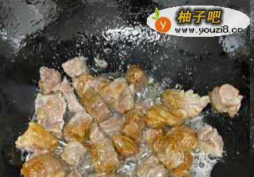3锅中热油,将冰糖炒至焦糖色。放入牛腩炒出糖色。
