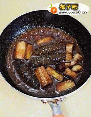 9最后慢慢的让海参在锅中进行收汁。让高汤和铺料完全融入海参当中。
