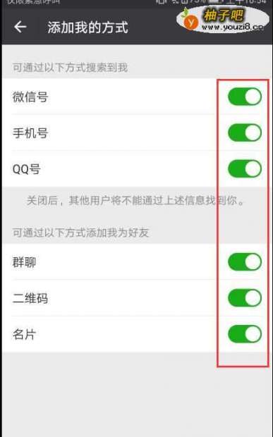 6如图,进入下面页面就能自由更改“搜索到我的方式”和“添加我为好友”的方式了~
