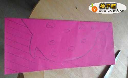 2将彩纸对折,在对折的一边画出草莓的轮廓,尽量画的自然一些,还需要画出草莓上的小圈圈,比例要合适,有实物的话最好比对一下。