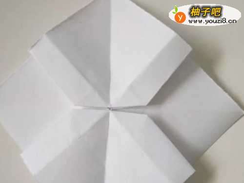 找到一张正方形的纸,颜色大小根据自己的喜好进行选择,将纸折成带有米字折痕,即对折转个面再对折,两个对角线分别折叠,然后将折成如图所示的样子