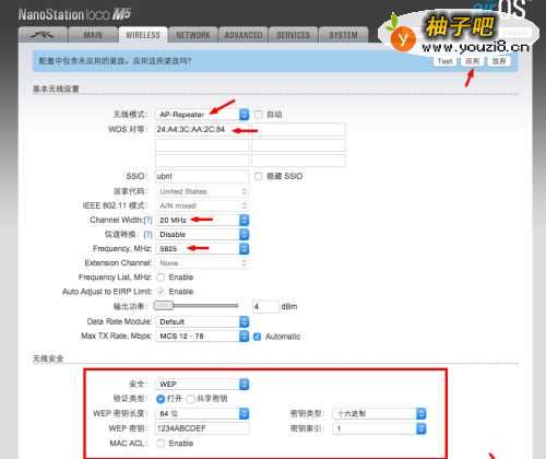 83. 切换到 WIRELESS 页面,选择 AP-Reapeater 模式,并在 WDS 对等(WDS Peers)里面填上要中继连接 AP 的 WLAN MAC 地址(如果有多台接收站需要中继需要都填入)、选择信道(Frequency, MHz)、频宽(Channel Width)以及 无线安全设定, 最后点击 更改 和 应用 完成一个中继点的设置: