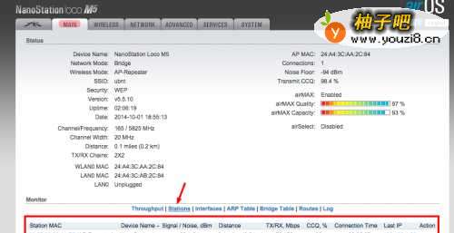 此时将两台 AP 的天线相互对准就会自动互连了,我们可以在相互的 MAIN 页面中查看连接状态: