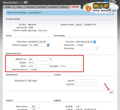 6以下为 手动设定 详细操作步骤:1. 为安全起见,进入设备管理平台,首先应该进入到 SYSTEM 页面下在 系统帐户(System Accounts) 中按 钥匙 图标修改用户名和密码 (这一点非常重要,我们所有的教程中即使没有提到也建议所有用户对所有设备做此操作,本教程中不再重复此操作,但请用户自行执行)。完成后点击 更改 ,但先不要应用。