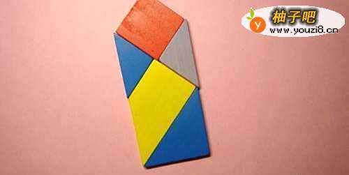 4然后,把橘色的梯形板与蓝色的三角形板连接,并摆放在紫色三角形板的下边,拼接位置,如下图所示。