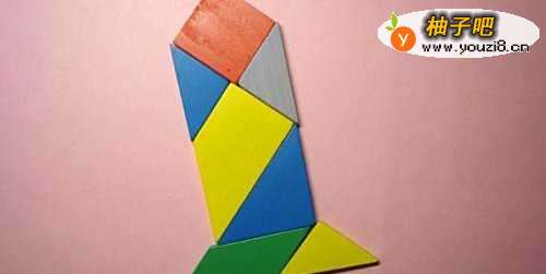 6最后,取红色的梯形板与白色的三角形板连接,并摆放在绿色平行四形板的下边,拼接位置,如下图所示。这样火箭导弹图形就拼好了。可以让孩子仔细看一遍后,自己动手拼图,并不断回忆拼图的顺序,这可以锻炼孩子的记忆能力。培养孩子的过目不忘的能力,对孩子以后的学习有帮助。