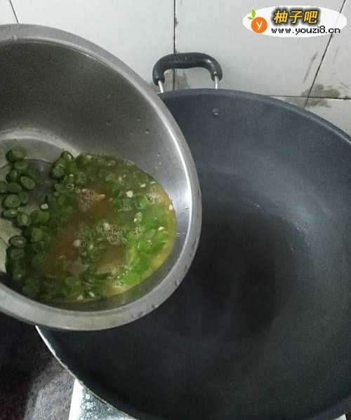 7水开倒入四季豆先烫一下,大概烫一分钟就可以了。