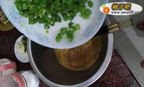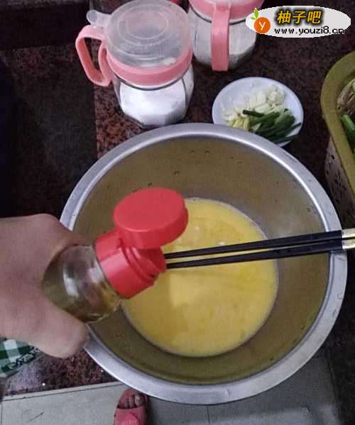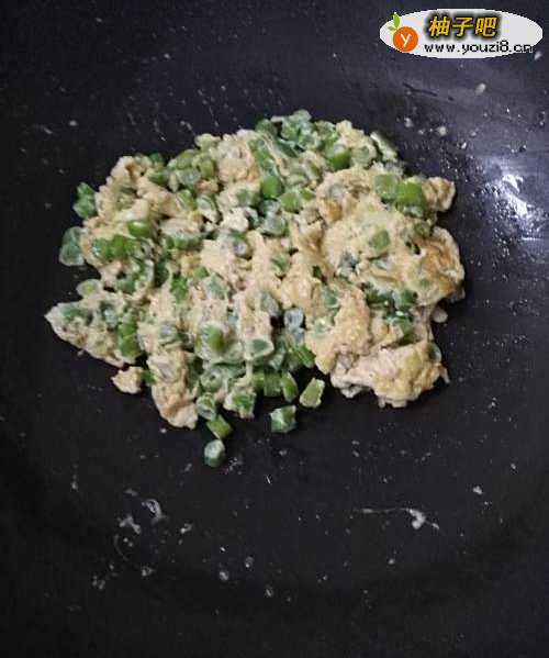 9将烫熟的四季豆倒入蛋液中,搅拌均匀。