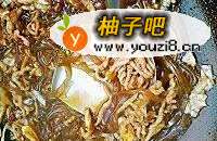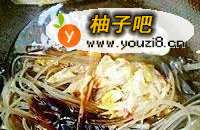 12煮到粉丝软烂加入肉丝,一起再煮一分钟。调入几滴香油,出锅撒葱花即可。