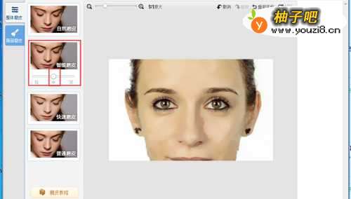 6在弹出的新窗口中选择【整体磨皮】,选择【智能磨皮-轻度】,接着选择【自然磨皮-中度】。