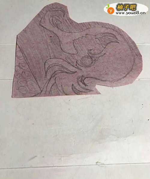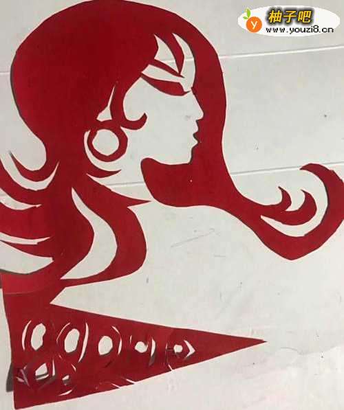 6第六步 剪完外围多余的彩纸之后 再剪我玩的修边部分 然后再里面的细节部分 女孩的耳环 眼部等 然后再剪侧面的边缘部分 最后再把里面的轮廓部分全部剪完就行了